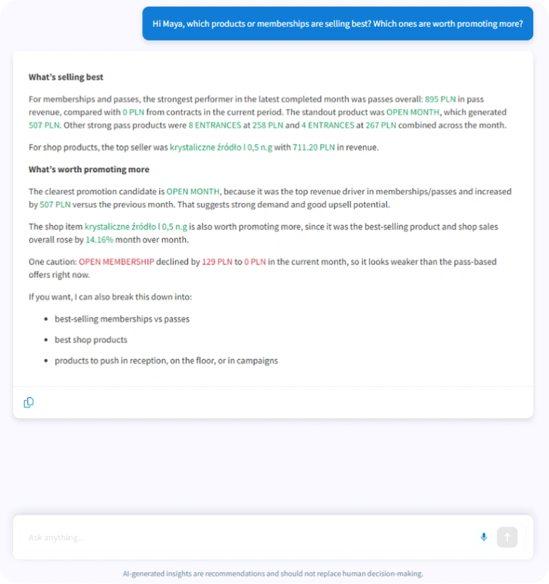 Maya AI not only shows what is happening in your club but also suggests what to do next to maintain growth and improve results.