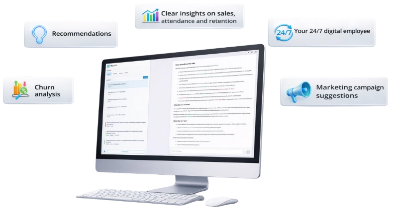 From membership renewals to shop sales and class occupancy, Maya AI delivers continuous monitoring of your club’s performance. It analyzes data in real time and transforms it into clear statistics, structured reports, and practical recommendations.